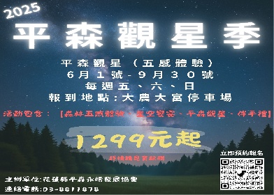 2025 - 平森觀星季【五感體驗 x】 暑假小孩放假在家好無聊? 那就全家大小來戶外體驗放鬆,賞星聽故事吧! 今年兩大主題活動,共同帶你創造假期放鬆回憶 ------------------------------ 【五感體驗・觀星饗宴】 時間:6/1~9/30,每週五、六...